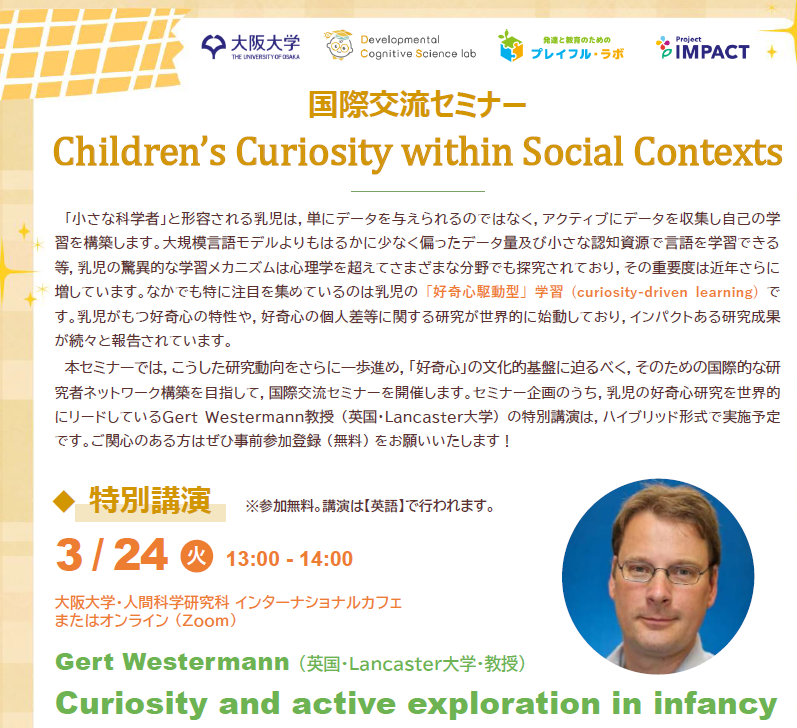 大阪大学・人間科学研究科にて,乳児の「好奇心駆動型学習」(curiosity-driven learning) に関する国際交流セミナーを開催します(2026年3月24日から3月25日)。 私の大学院時代のスーパーバイザーであるGert Westermann教授による特別講演も実施されます。 私も,保育士を対象にしたウェアラブル型アイトラッカーについての研究発表をする予定です。